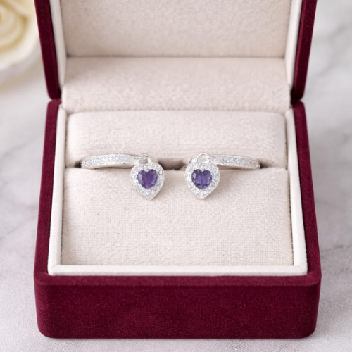 O brinco de argola cravejado com pedra em formato de coração na cor lilás é a escolha perfeita para quem ama acessórios com significado e elegância.
