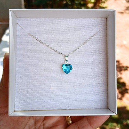 Banhado a prata 925 (70 milésimos) e finalizado com verniz italiano, ele traz brilho duradouro e um acabamento impecável. O coração de 8mm cravado em azul claro ilumina o colo com suavidade, ideal para usar todos os dias ou presentear alguém especial.